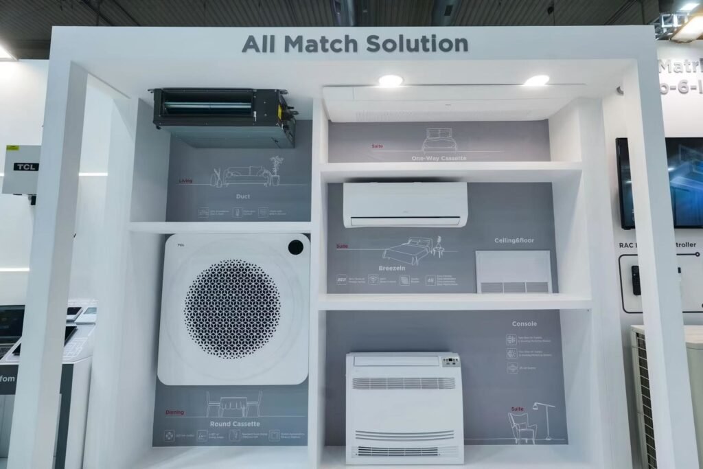 Im Mittelpunkt steht TCLs Free‑Match‑Lösung für die Klimatisierung, bei der sich bis zu sechs Inneneinheiten an eine einzelne Außeneinheit anschließen lassen und so eine flexible Mehrzonen‑Klimaregelung in unterschiedlichen Räumen ermöglicht wird.